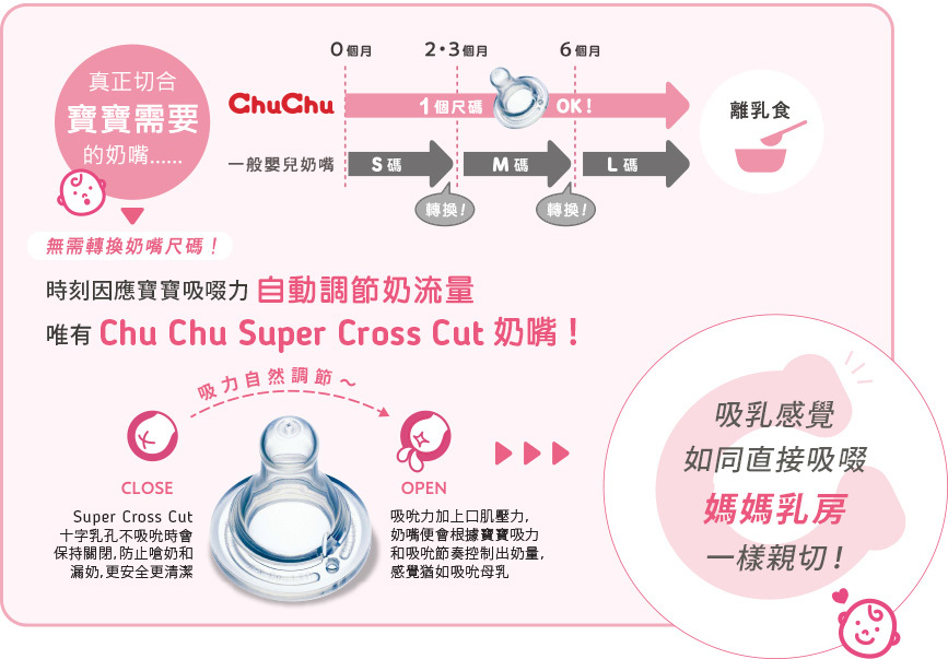 • Super Cross Cut 奶嘴獨有設計,根據寶寶吸力自然調節流量,不吸吮時不會出奶,避免嗆到寶寶