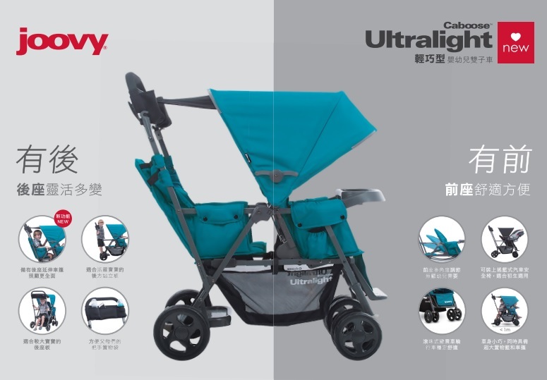 美國 Joovy Caboose Ultralight,車架以 6061 飛機鋁合金製造,令這部「兄弟車」可承載高達 90 磅,但體積只與一輛普通單座位嬰兒車相若,既堅固又輕巧!產品包括 Caboose 後座。