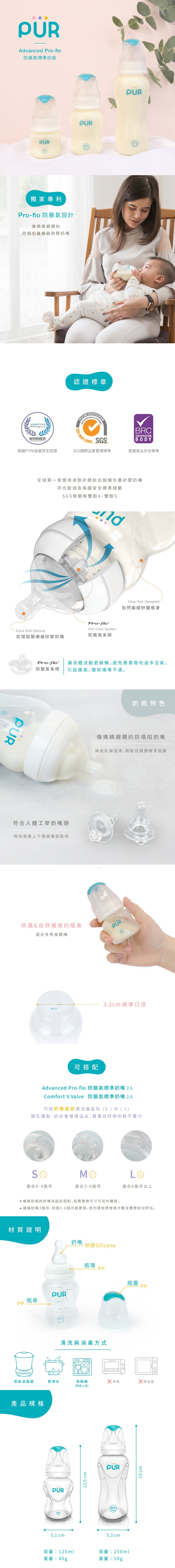 PUR Advanced Pro-flo防脹氣標準奶瓶 125ml/4oz配S碼奶嘴