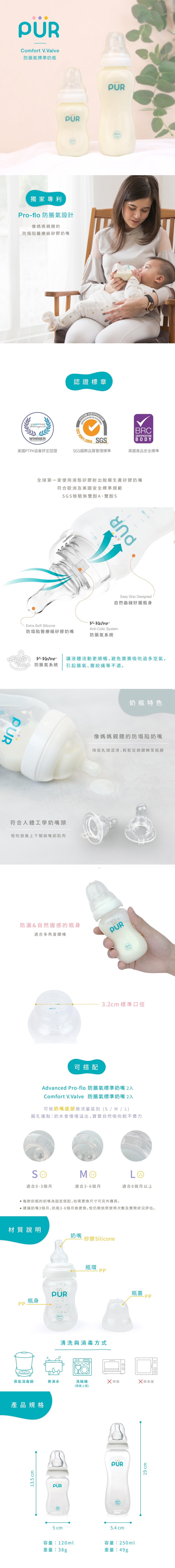 獨特的奶嘴設計經臨床驗證,底部 V 型氣閥系統可以讓寶寶餵哺時排氣,並提供更流暢的液體流動,從而防止奶嘴塌陷,防絞痛及防脹氣。