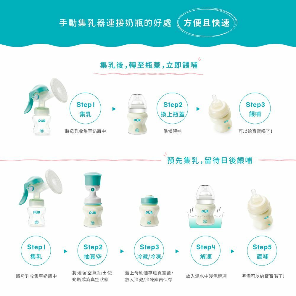 寶寶在最新鮮的母乳中獲得豐富營養,PUR 手動真空集乳器,單向空氣流動傳遞,減少集乳時因空氣對流而使乳房接觸外部細菌。