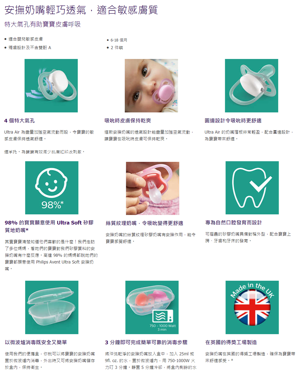 使用令肌膚舒爽的安撫玩嘴來安撫您的寶寶。Philips Avent ultra air 系列設有特大氣孔,讓寶寶的肌膚保持乾爽。輕巧玩嘴擋板經過專門設計,改善空氣流動更佳。備有各種顏色及設計可供選擇。
