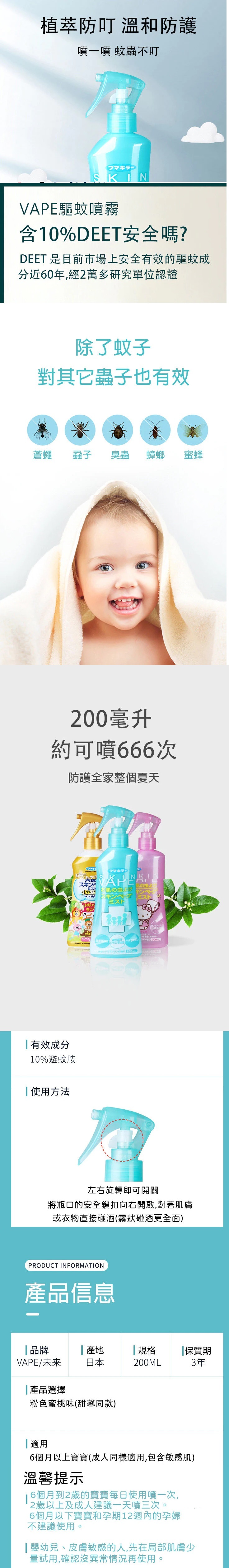 配合10%防蟲成分,每次使用有效持續驅除蚊蟲約6-8小時