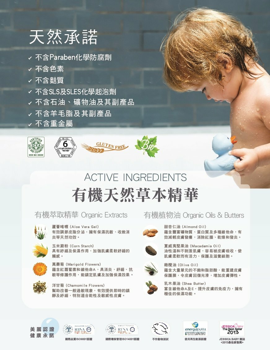 天然有機成分:維他命B5、氧化鋅、蜂蠟、甜杏仁油、萬壽菊、甘菊花多功能複合物、維他命A及E