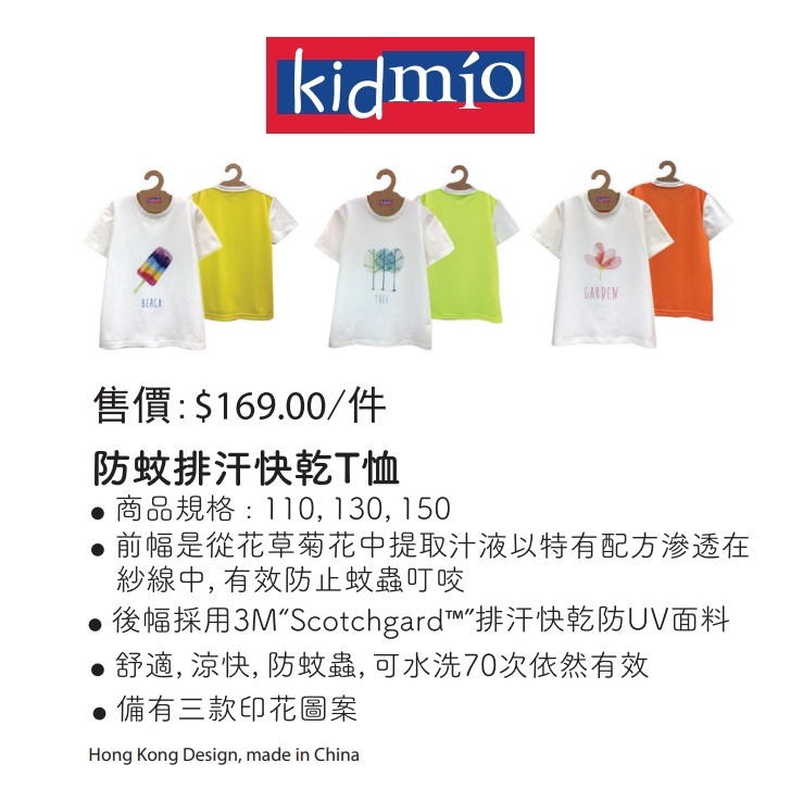 時尚戶外兒童品牌 Kidmio 推出輕量防蚊排汗快乾衣,有效地驅趕蚊子,其獨特驅蚊配方能滲透在紗線中,免受蚊蟲干擾,而後幅採用"Scothcgard"排汗快乾防UV面料,有效將汗水帶走,保持乾爽/涼快,T恤圖案採用數碼打印不怕脫色,可多次水洗,面料保持柔軟透氣。