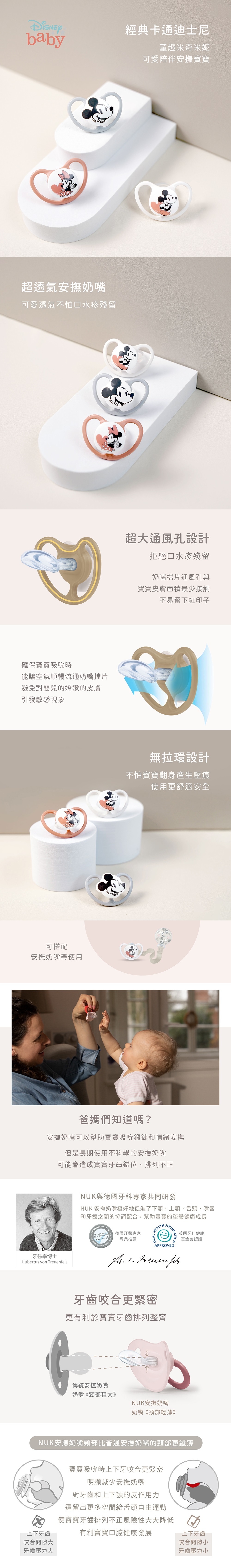 迪士尼米奇授權款可愛安撫寶貝,搭配獨創超大透氣通風孔設計有效預防口水疹,德國牙醫學專家研發推薦,仿母乳拇指型奶嘴設計訓練寶寶吸吮,減少齒列不正風險,滿足口慾期安撫需求,不含雙酚A,貼心附防塵儲存盒,守護口腔健康發展