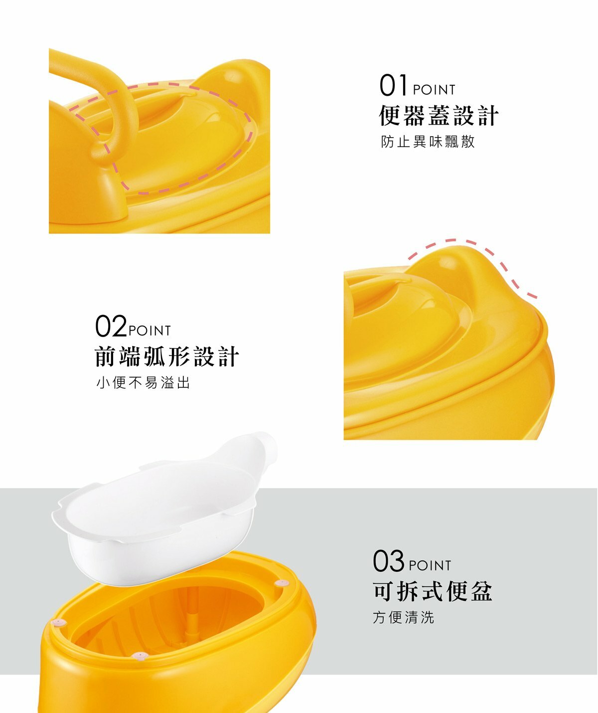 • 前攜式握把可讓寶寶練習雙手握持,並讓寶寶減輕上廁所對高度 的不安,長大後亦可將握把置後當靠背,讓寶寶更容易的完成重要任務。